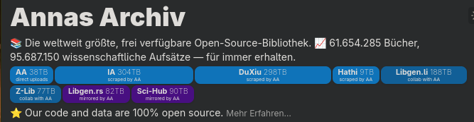 Eigentlich geil, dass Annas-Archive hier (mutmaßlich) eine Finanzspritze bekommen hat. Diese Schattenbibliotheken sind quasi konstant kurz vor dem Aussterben - weil sie eben illegal sind. Aber sie sind das Nächste was wir zu einer modernen Bibliothek von Alexandria haben.